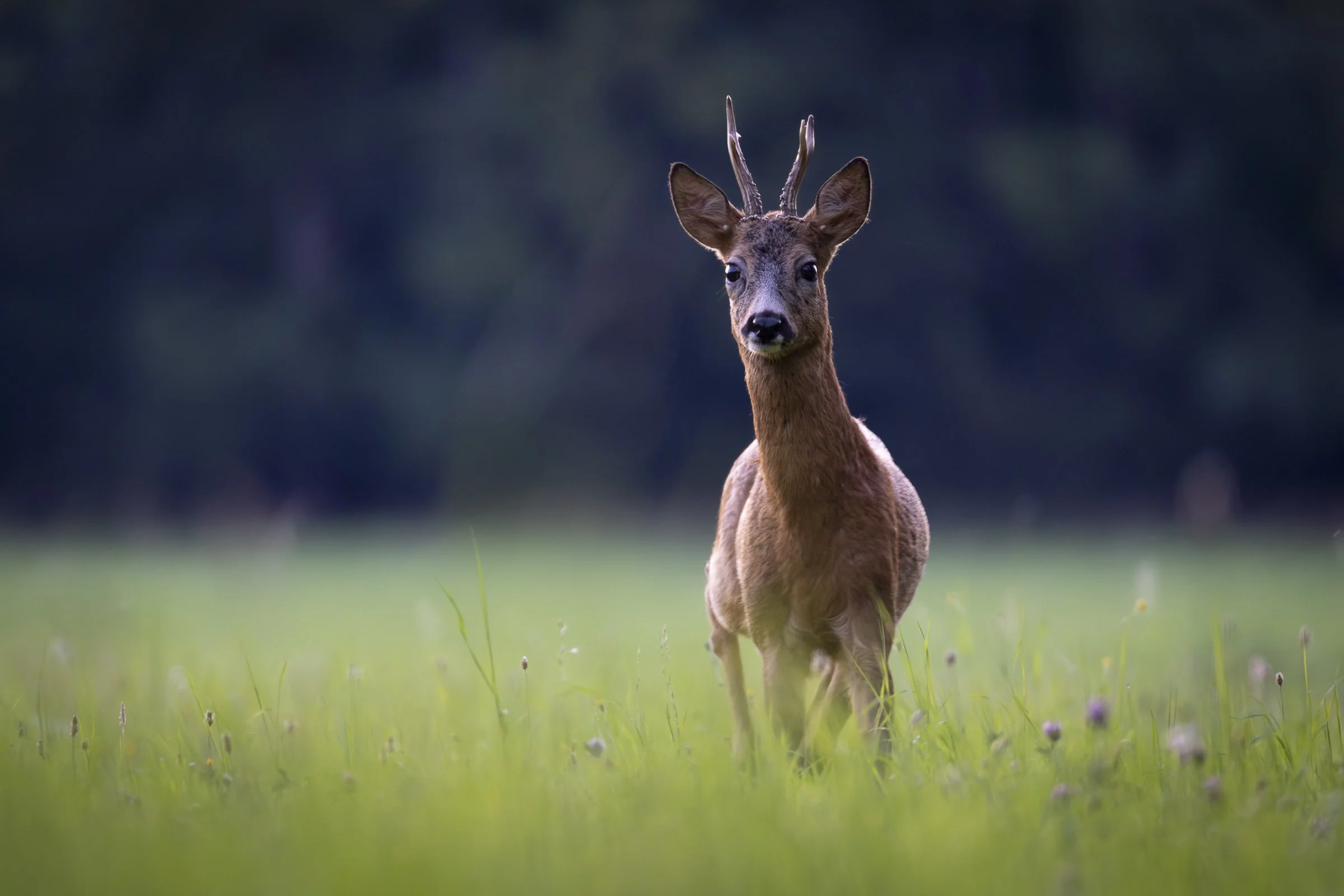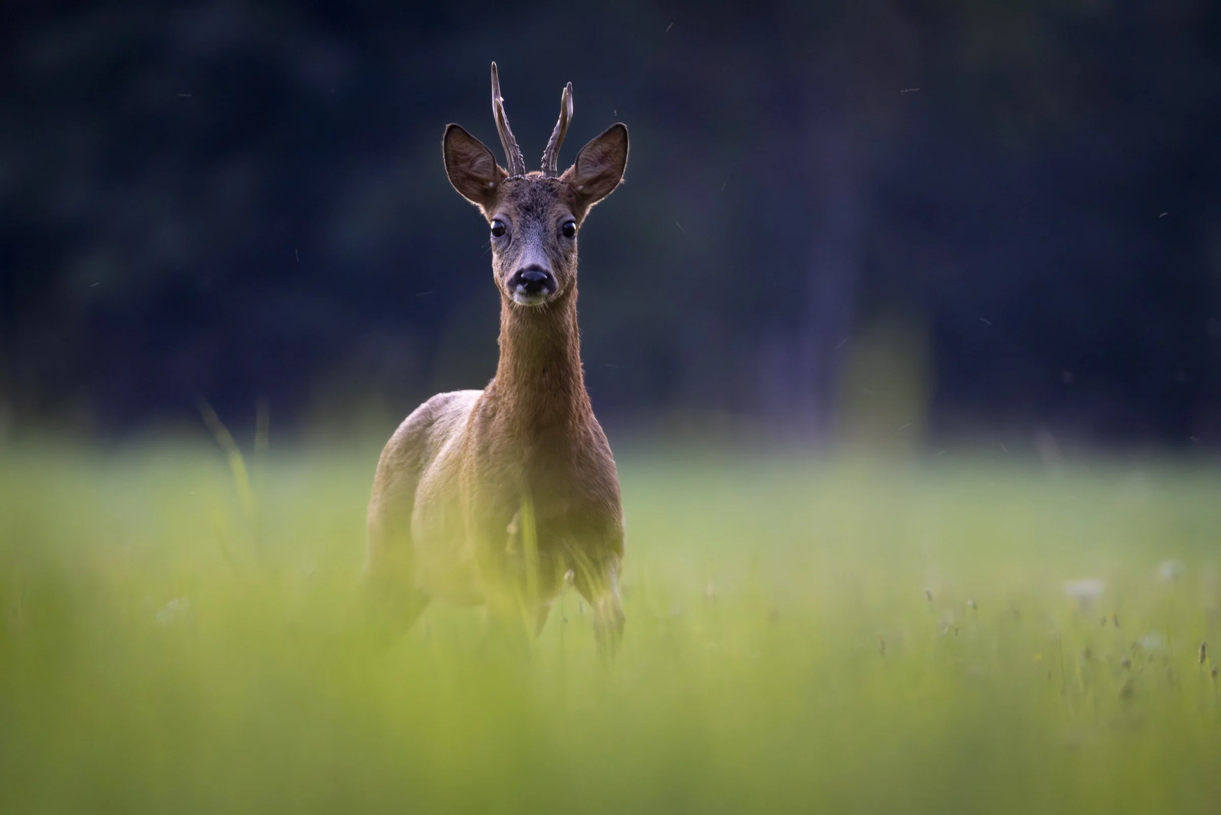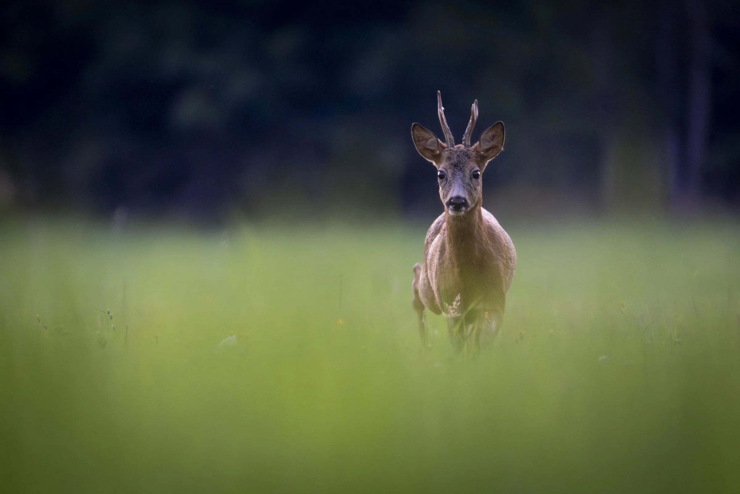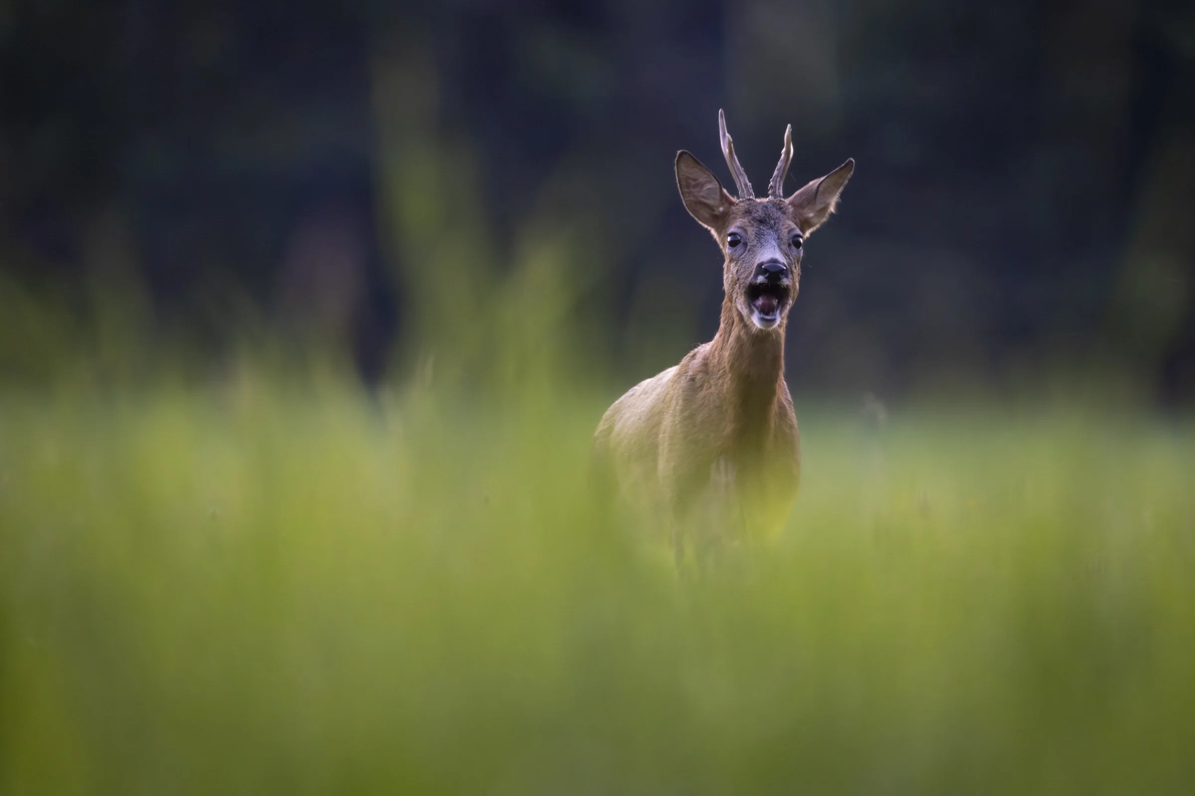 Mid August I met a very inquisitive young roe deer: It was very late in the evening. I had been sitting well hidden in the tall grass and shadows on the edge of a clearing in a local wood for quite some while, when first a doe (the female roe deer) appeared on the clearing to feast. It eyed me and then without much hesitation went out in the open grass space. A little later, the buck appeared. At first, he did not notice me at all. But when he did, the magic started to happen.